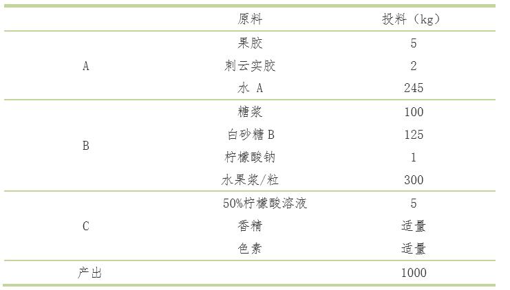 低糖水果果醬工藝配方 本方案適用于制作可溶性固形物為大約31°Brix的水果果醬產品。緊跟市場潮流,低糖果醬,健康食品。工藝流程:制備穩定劑溶液:將果膠及刺云實膠,加入快速攪拌85-95℃水A中,溶解;化糖和糖制:將糖漿、白砂糖B、檸檬酸鈉、水果和果膠溶液倒入夾層鍋, 攪拌加熱至微沸;風味調整:冷卻至70℃~80℃,添加檸檬酸溶液、香精、色素溶液,攪拌均勻。罐裝:灌裝后迅速冷卻至室溫。 分享到: 新浪微博 微信 QQ好友 QQ空間 豆瓣 « 胡蘿卜素-卡拉膠軟糖方案 沒有了 »