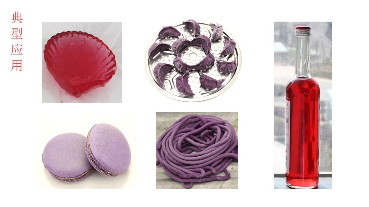 典型應用:作為食品原料、保健品原料、天然食品著色劑(按當地法規)。在食品、飲料、蛋糕等行業中被廣泛地應用。